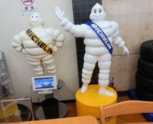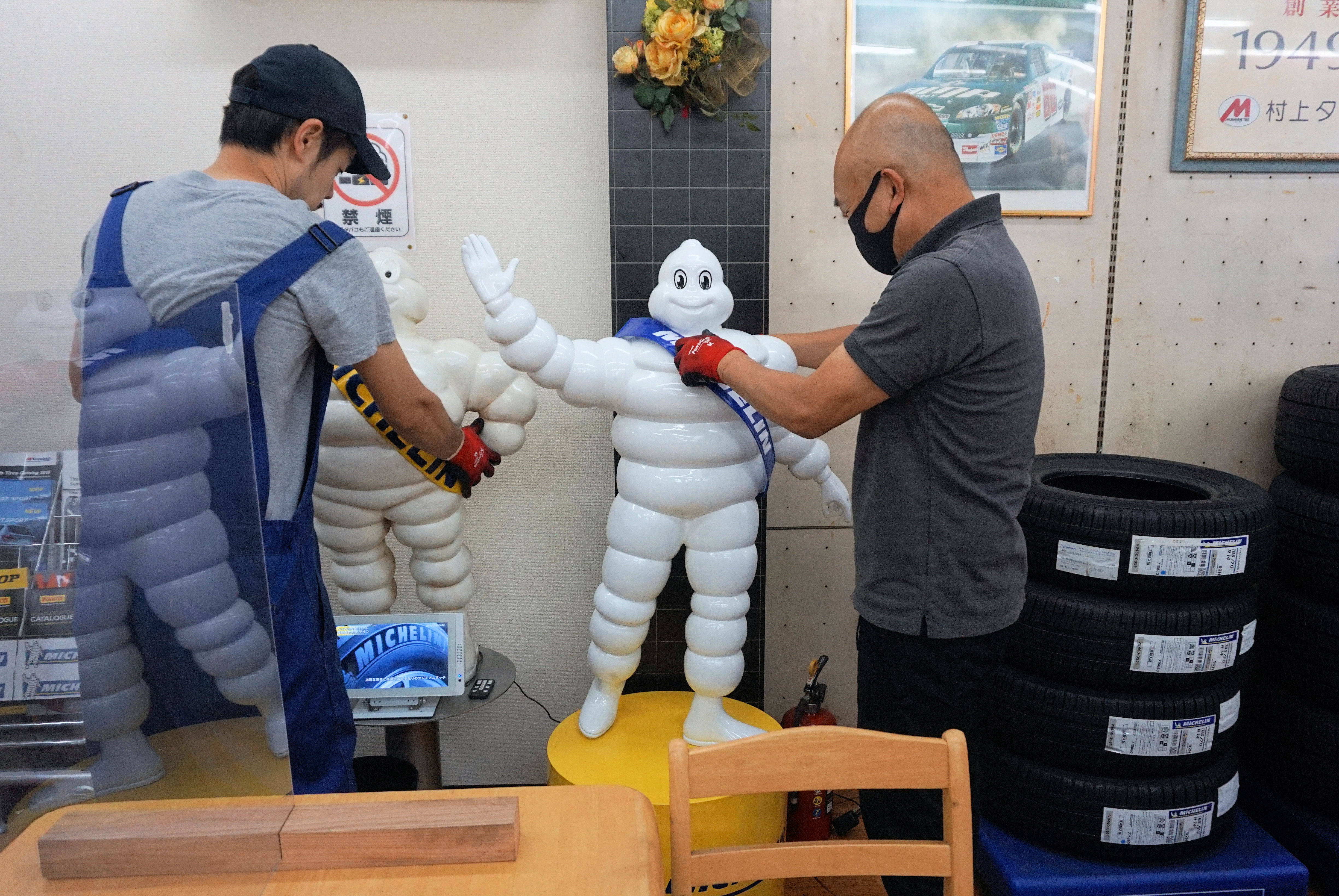 さっそく組み立てて、店内に展示。新旧比べると、最近のミシュランマンがいかにスリムになっているか分かります。従来の太めのも、愛嬌があっていいとは思います😃。