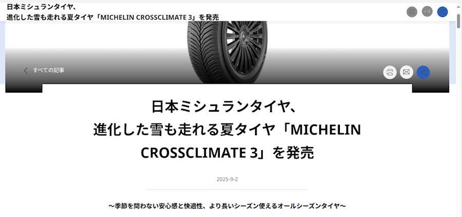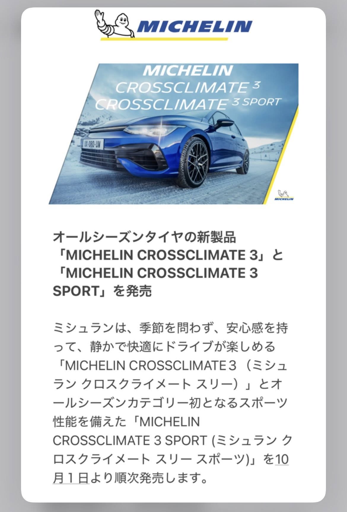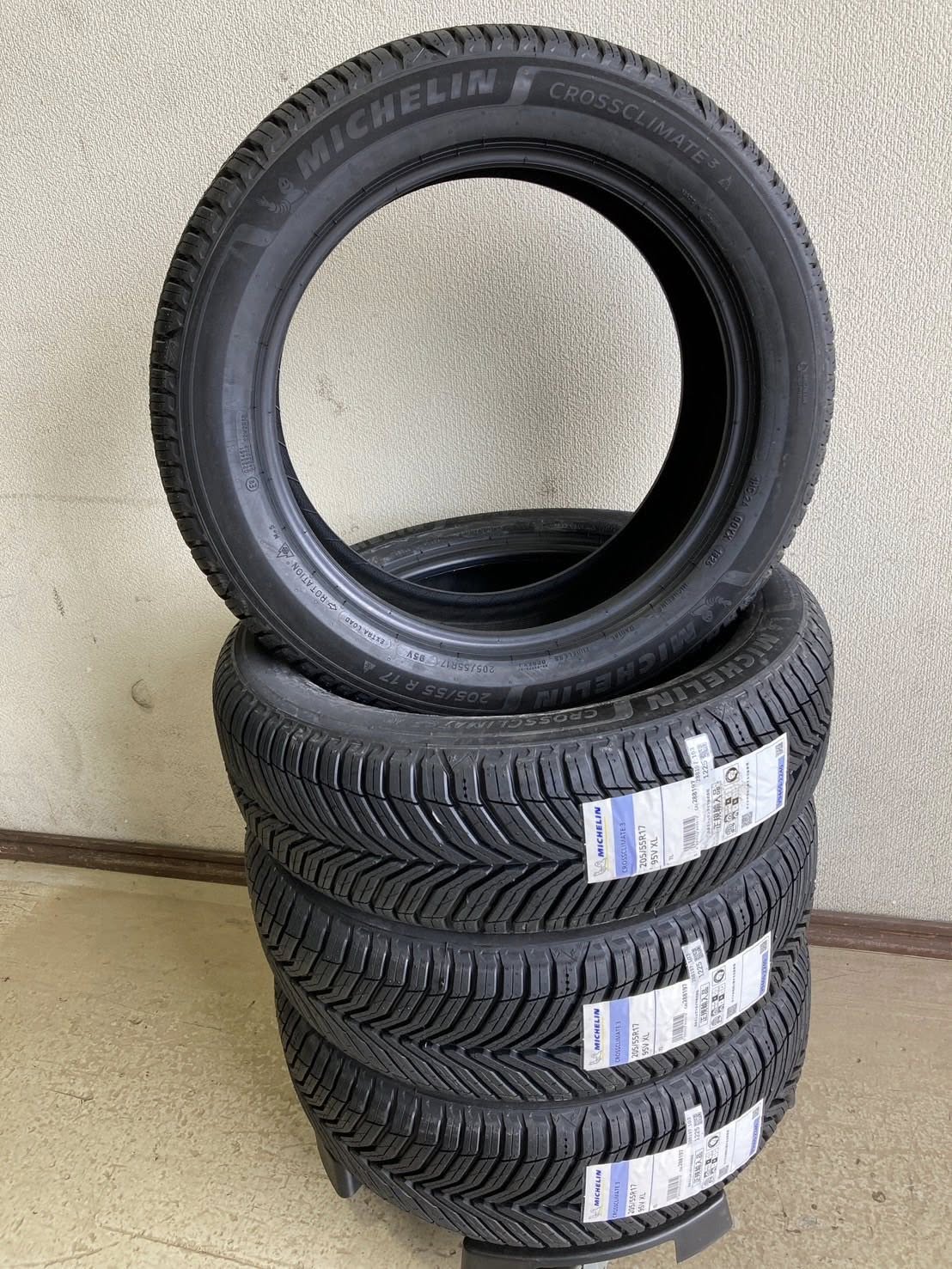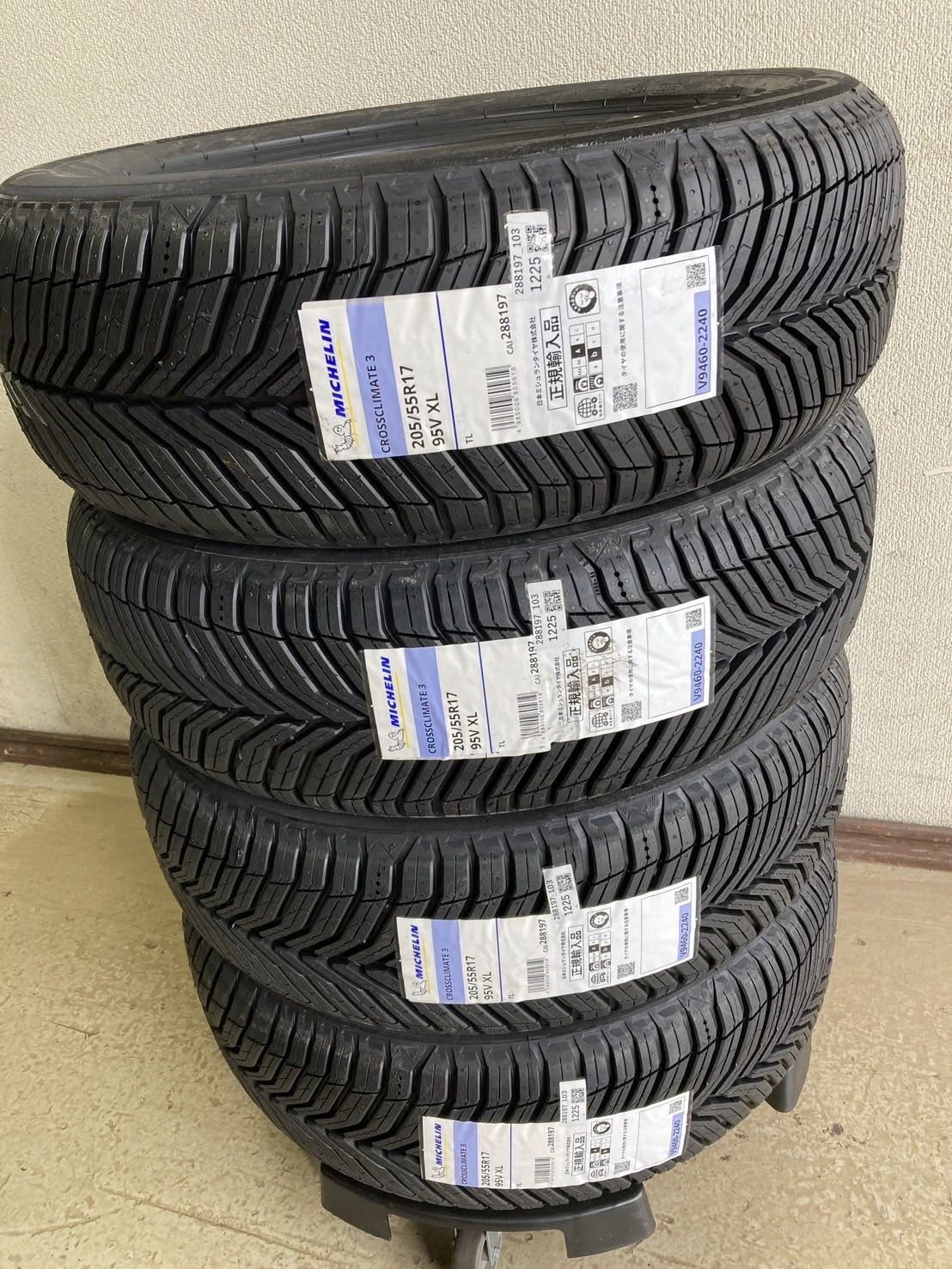 今月2日に発表になった「ミシュラン・クロスクライメート3」、10月1日が発売開始ですが、24日から出荷が始まっています。この商品の最初のご注文は、ホンダ・ストリームRSZのお客様からの205/55R17 97V 四本です。それが到着しました。