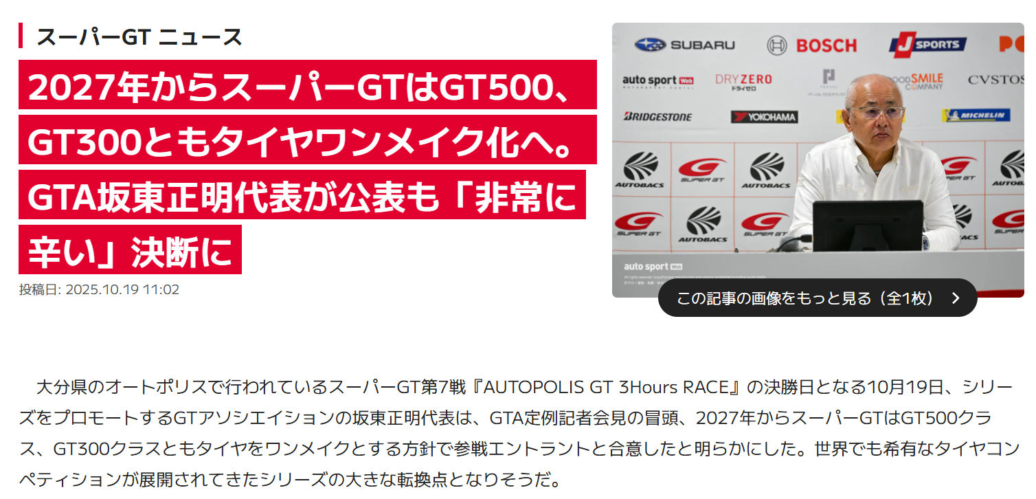 2027年からスーパーGTは「GT500クラス、GT300クラスともタイヤをワンメイクとする」と、昨日(10/19)オートポリスで発表されました。世界的に四輪レースでの『ワンメイク化』が進む中(F1ですらピレリのワンメイク)、日本のスーパーGTレースは例外的に