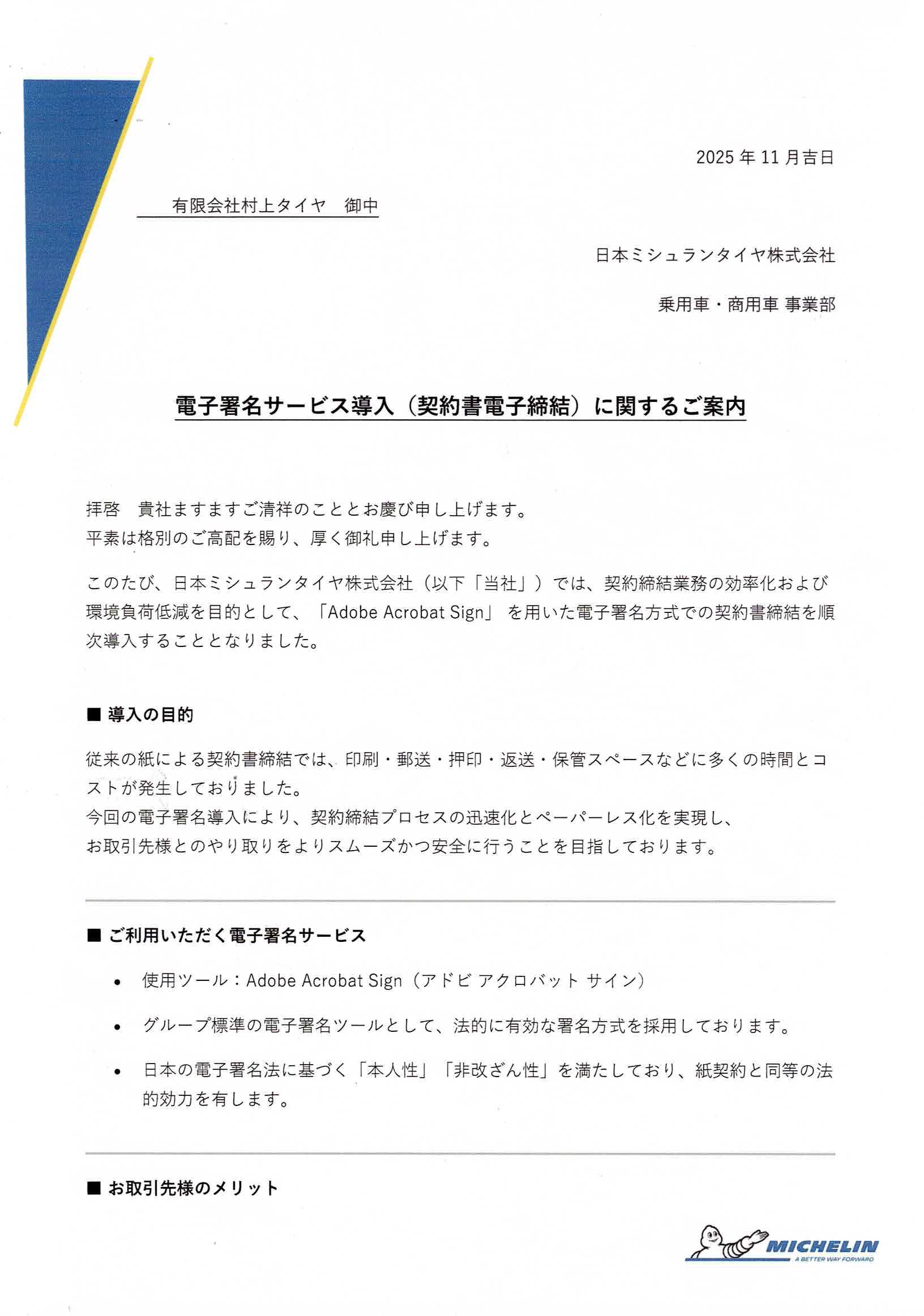 日本ミシュランタイヤ社から、案内をもらいました。これまで同社とウチのような販売店とは、紙の「契約書」に署名・捺印していました。それを、今後は電子化するとのこと。 . 同社は既に、販売店への「納品書」や「請求書」は電子化していました。自然な流れかと思います。