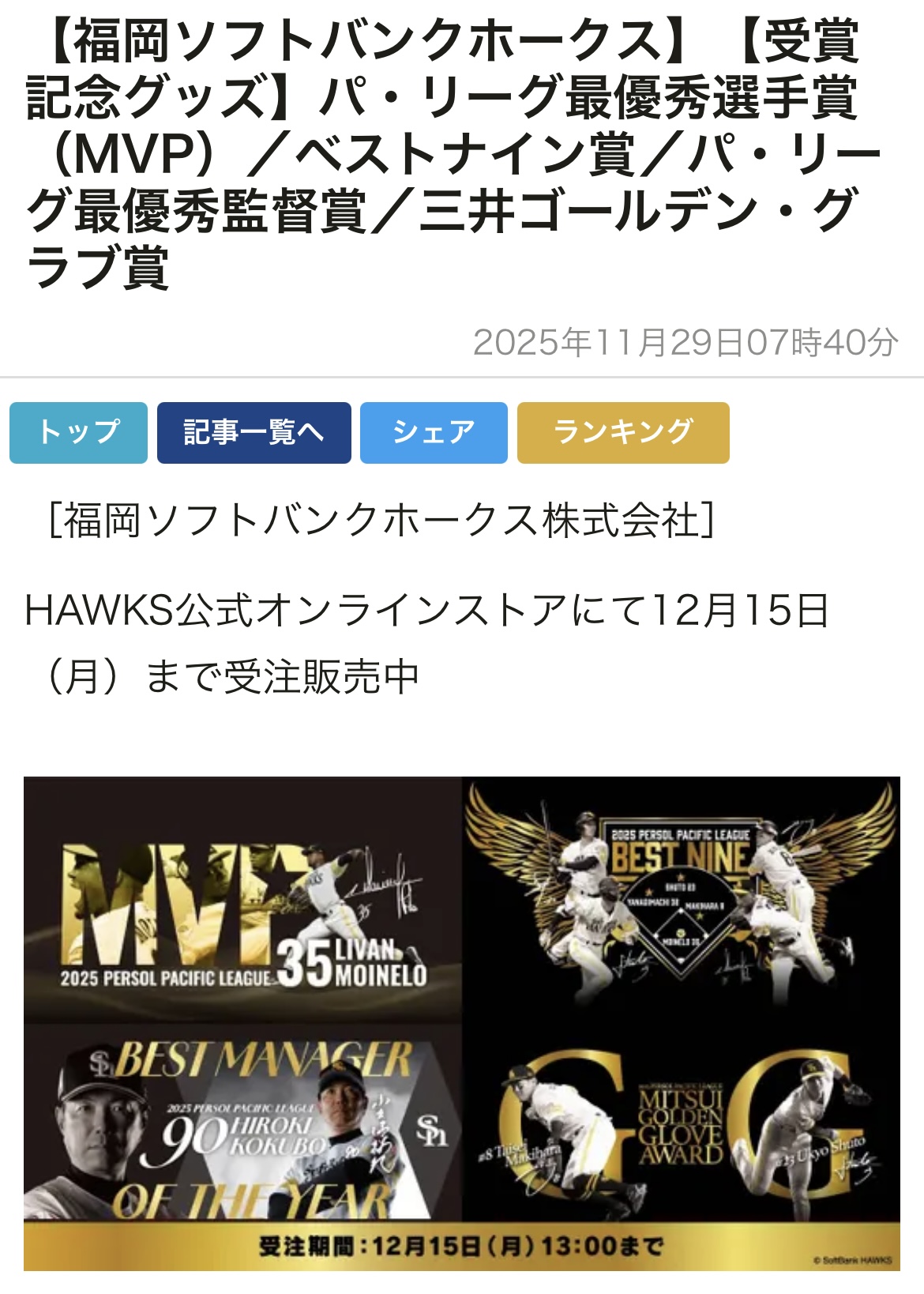 ホークスの受賞記念グッズ