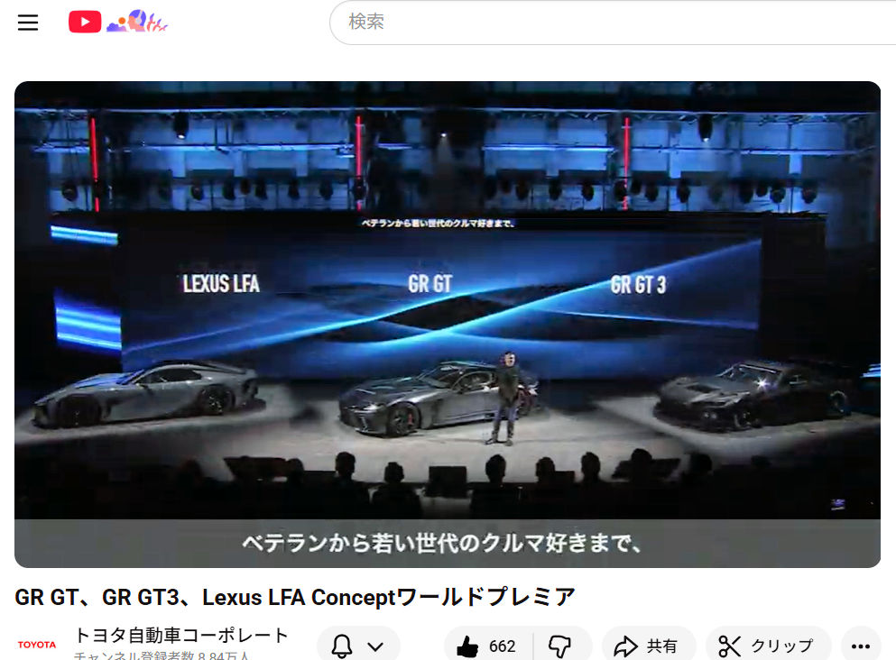 トヨタから、たった今 GR GT GR GT3 Lexus LFA Concept の三種類の、素敵なスポーツカーが発表されました。Lexus LFA ConceptはBEVだから好きじゃないし、GR GT3はサーキット特化の車種だろうから、GR GT買うかなぁ(大嘘)。