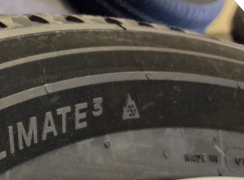 今年10月に発売開始になったクロスクライメート3はオールシーズンタイヤであり、二番目の画像のように「「スノーフレークマーク(3PMSF)」が刻印されています。高速道路冬用タイヤ規制時もそのまま走行可能で、季節ごとのタイヤ履き替えの手間が省けます。