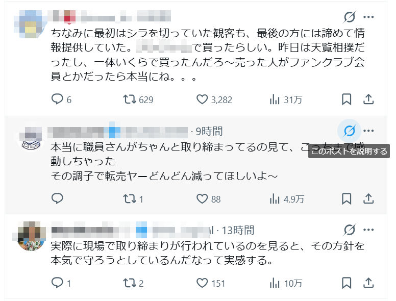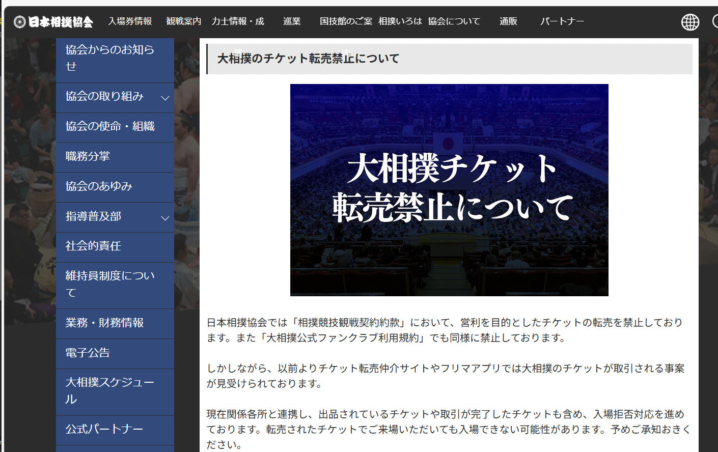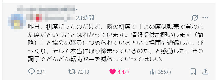 日本相撲協会のサイトや、大相撲初場所を見に行かれた方のSNSへの複数の投稿を見ると、同協会は「転売ヤーの排除」に本気のようです。根絶は難しいにしても、現場でのそのような努力は称賛に値すると思います。