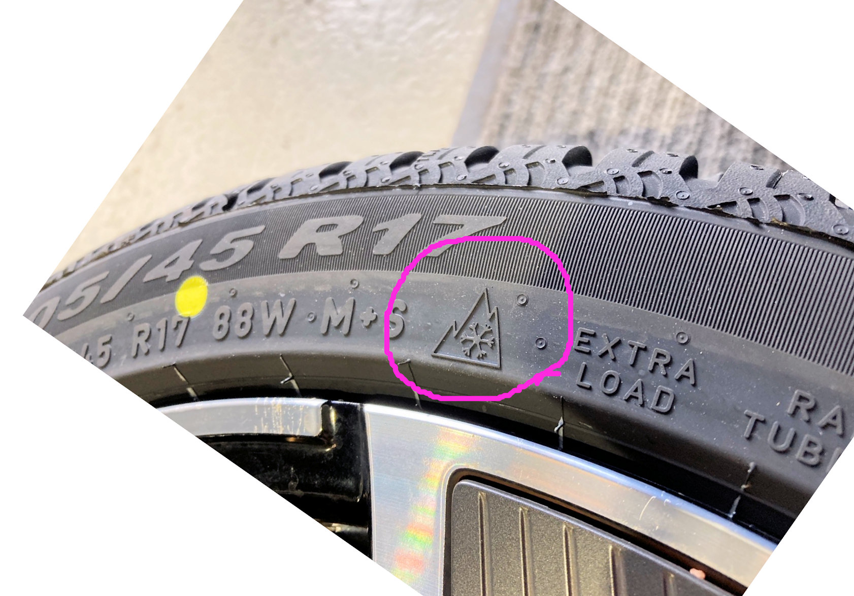 二番目の画像のように、このタイヤには「スノーフレークマーク」が刻印されています。冬用タイヤ規制時でも走行が認められます。