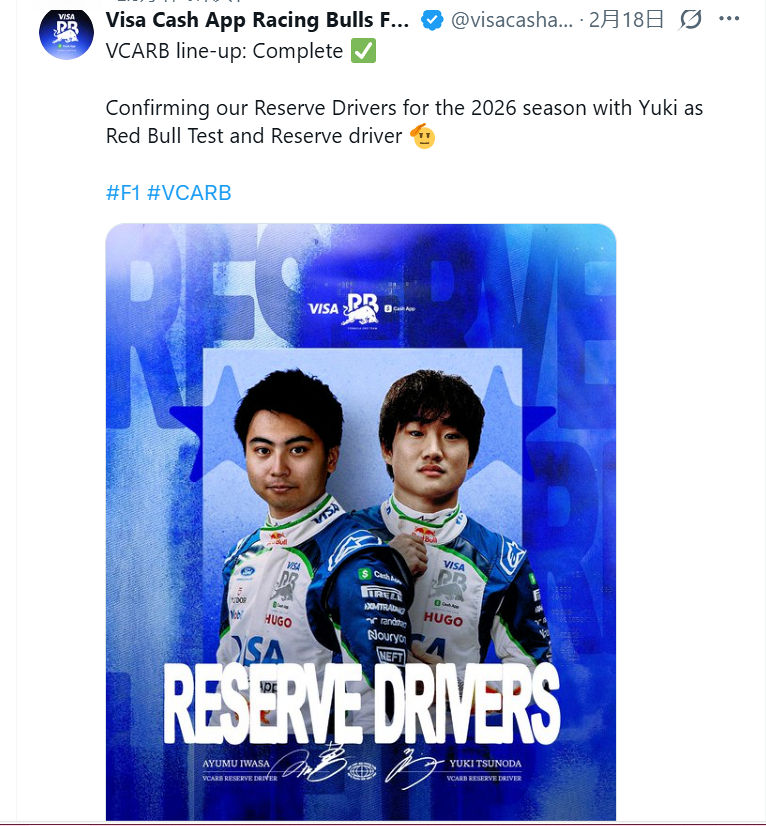 F1のレーシング・ブルズ(VCARB)チームが、2月18日に2026年シーズンのリザーブドライバー体制を発表。岩佐選手と角田選手の、2人の日本人が(レギュラードライバーではない)リザーブドライバーと正式発表されました。