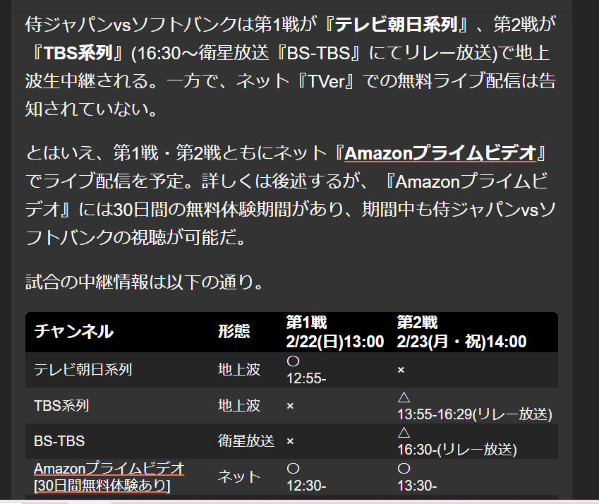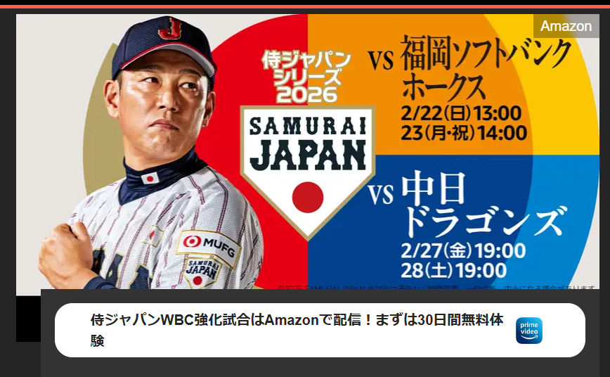 球春到来!!ワールド・ベースボール・クラシック(WBC)に出場する日本代表「侍ジャパン」が、福岡ソフトバンクホークスと対戦する壮行試合は22日と23日、宮崎市のひなたサンマリンスタジアム宮崎で開催されるそうです。この2試合は、地上波テレビや、(私がが会員になってる)Amazonプライムビデオで観ることが出来ます。本番のWBCはNetflixの独占配信ゆえ、会員になるか悩み中です。