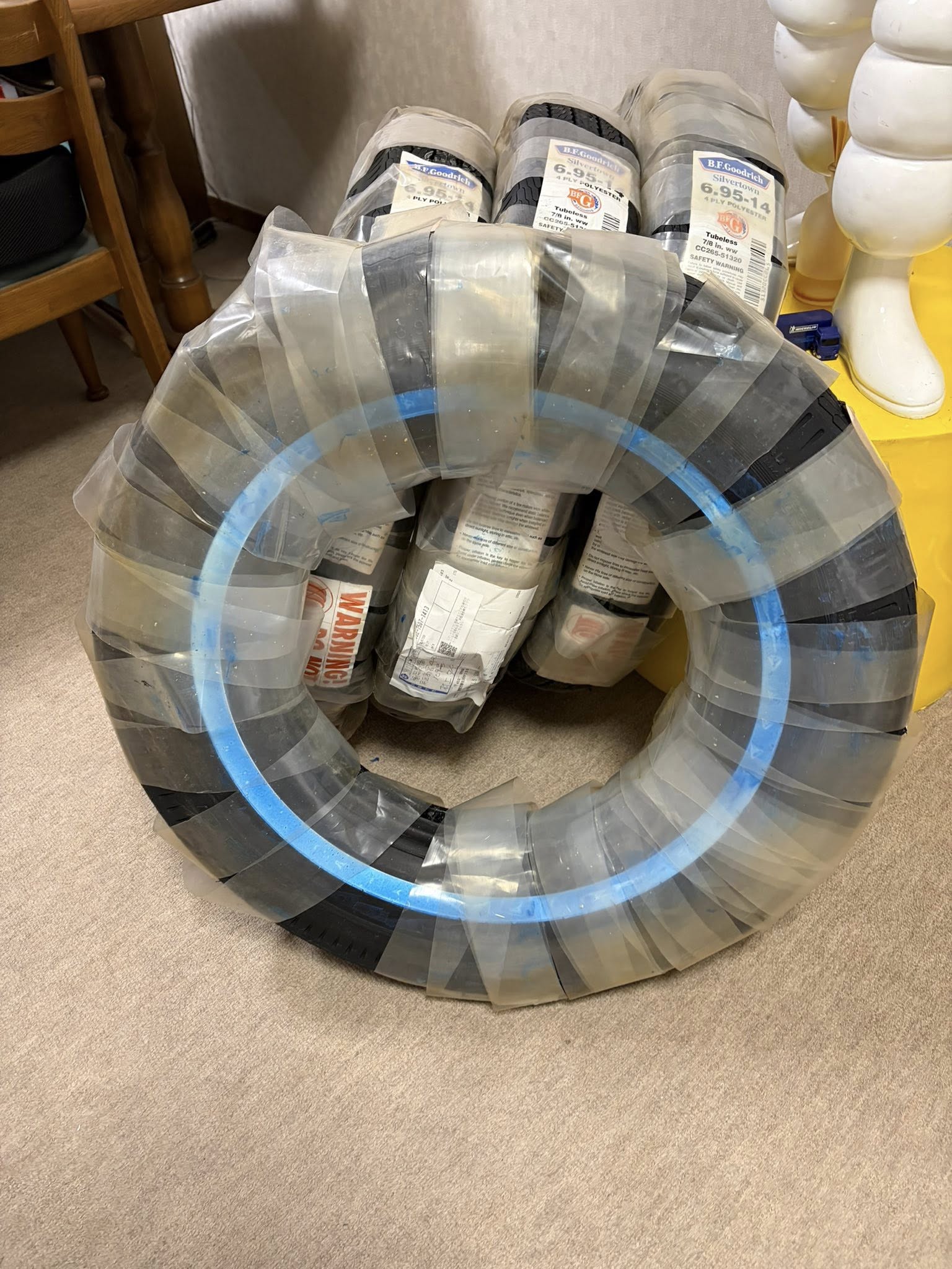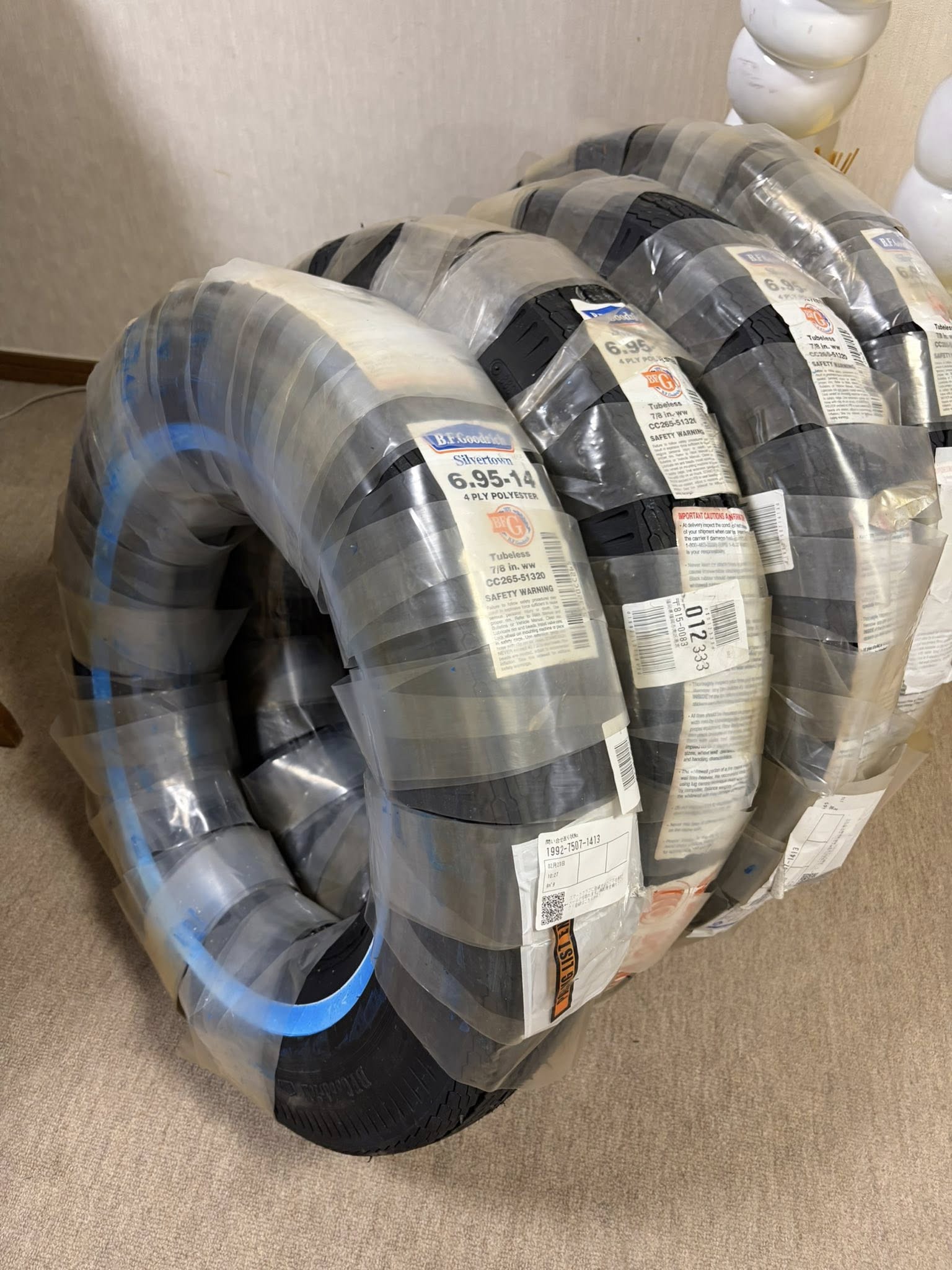 BF Goodrichのホワイトリボンタイヤが到着。ご注文頂いたお客様へ、佐川急便で出荷の予定です。青く見えるのは「保護剤」です。これを落とせば、白くなります。