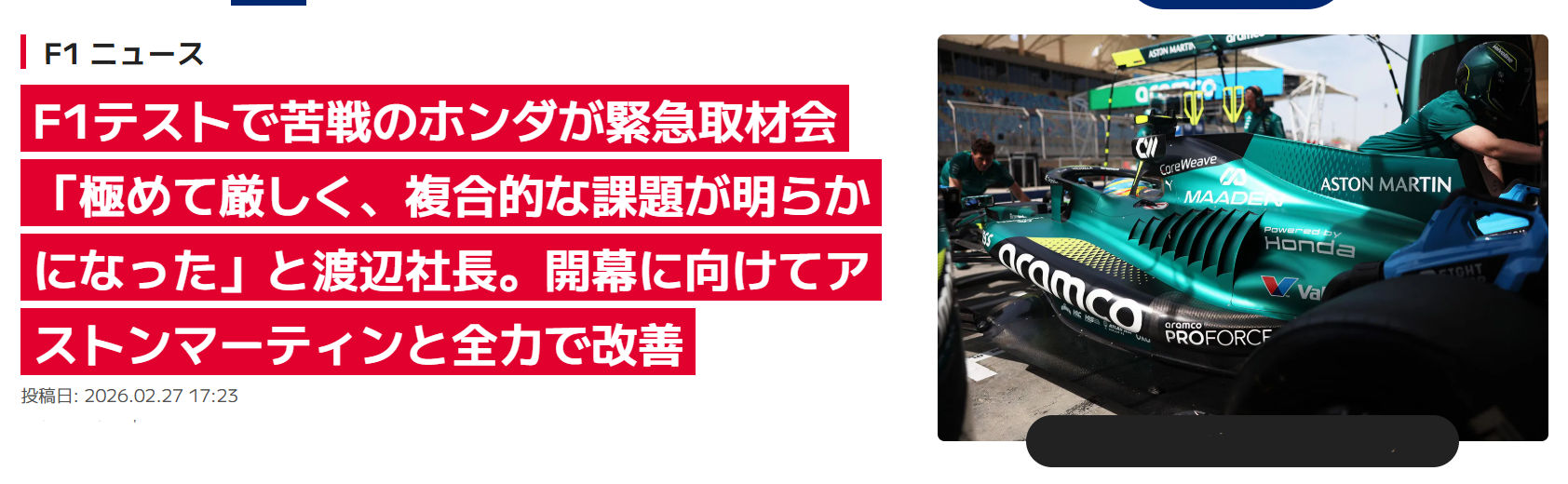 来週の金曜(3月6日)、オーストラリアGPのFP1とFP2が行われます。今シーズンのF1も開幕です。そんな中、心配事はアストンマーチン・ホンダのプレシーズンテストでの不調。開幕戦までに、改善されるのを願っています。